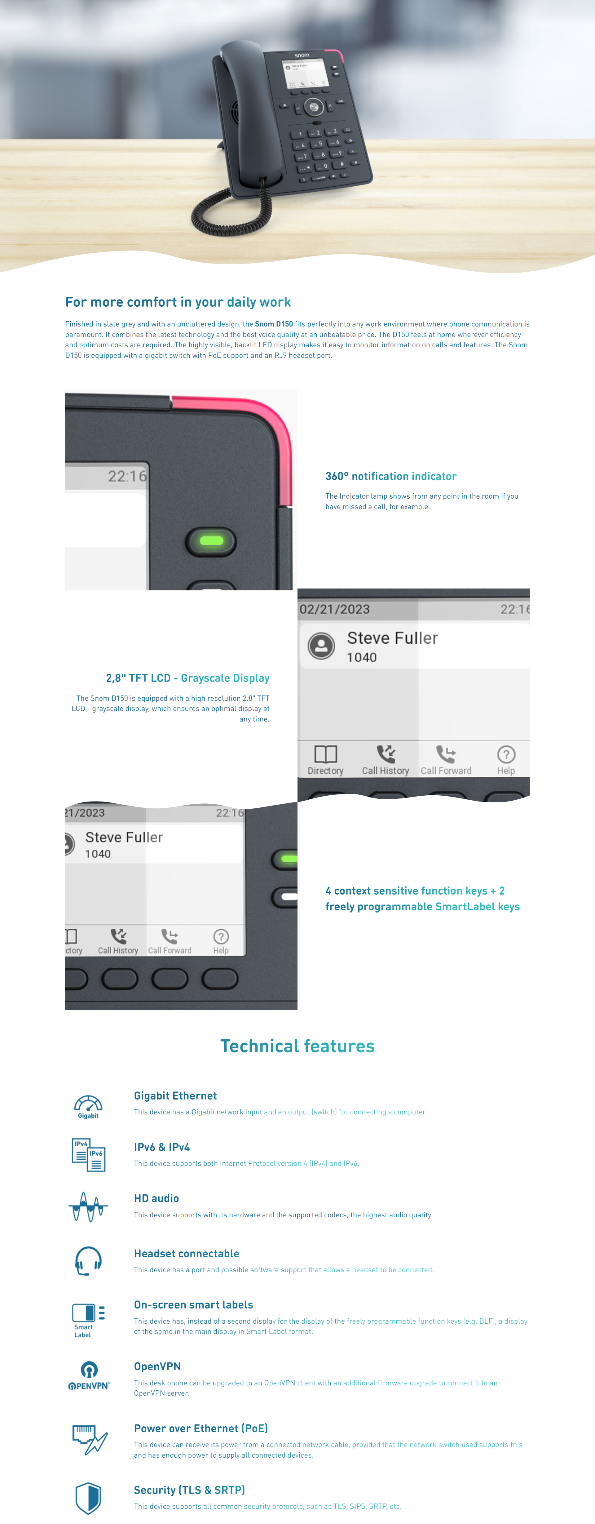 Finished in slate grey and with an uncluttered design, the Snom D150 fits perfectly into any work environment where phone communication is paramount. It combines the latest technology and the best voice quality at an unbeatable price. The D150 feels at home wherever efficiency and optimum costs are required. The highly visible, backlit LED display makes it easy to monitor information on calls and features. The Snom D150 is equipped with a gigabit switch with PoE support and an RJ9 headset port.
